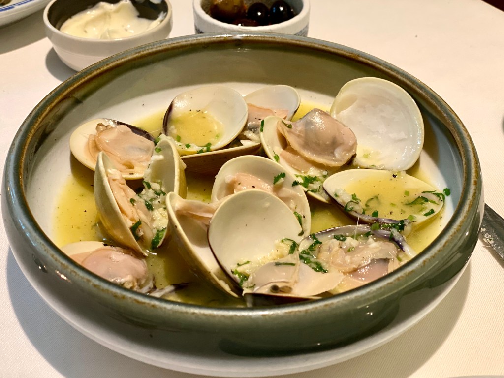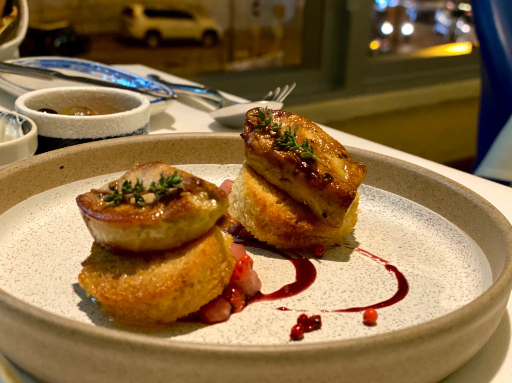 「釀蟹」肉質細膩,醬汁微酸保持了它的鮮度。「鱈魚球」帶土豆泥,外皮夠薄,很香。「酒煮蜆子」與牛油和蒜蓉向來是最好的搭配,味道香而不重,為鵝肝的登場做好鋪墊。最後,也是最出色的—鵝肝。「煎鵝肝」入口即化,鵝肝除了鹽和胡椒無其他調料,濃郁的肝香襯托剛過油的白麵包和甜酒醬,口感雖豐富,搭配恰到好處,並不喧賓奪主。