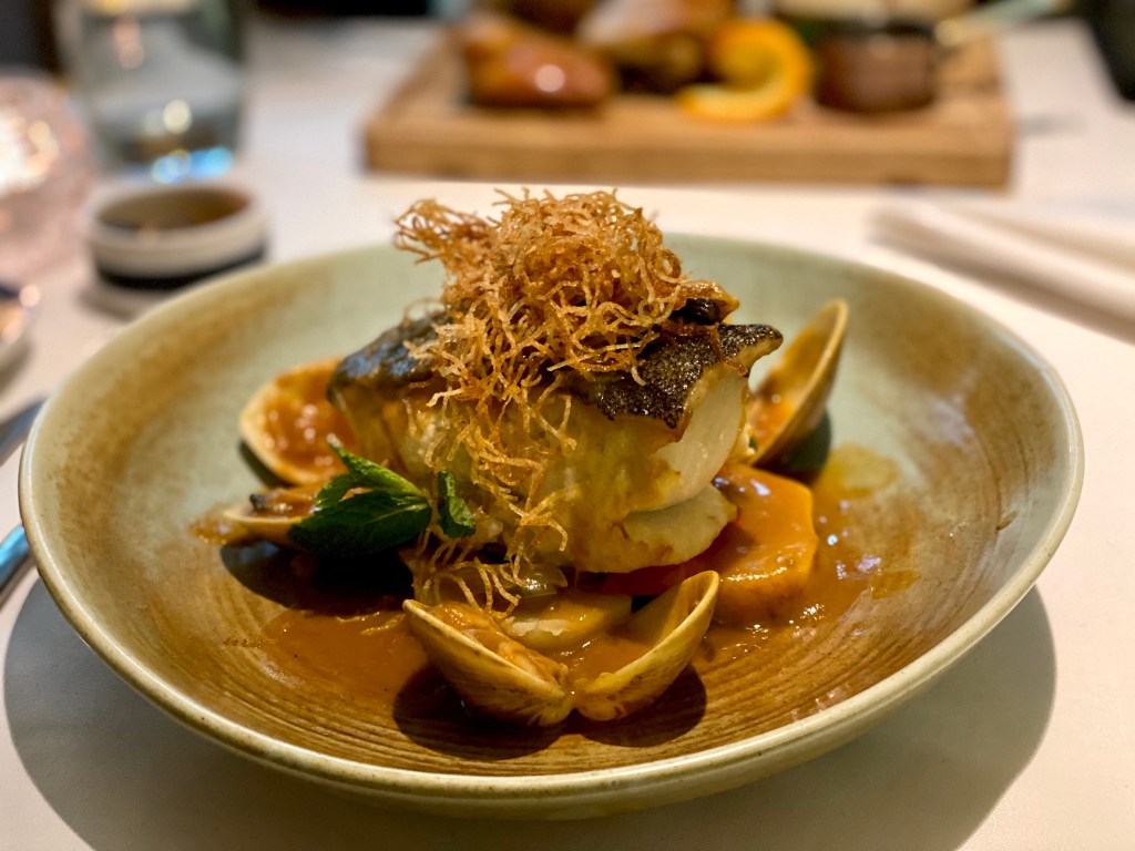 我的主菜是銀鱈魚拌海螯蝦慕斯琳,原本想點烤和牛臉頰,但因為每次都點這個,今天想嘗個新的。結果完全不後悔,能把魚和海螯蝦做到這種口感層次我徹底拜服,在烹飪上給了我很大的靈感。銀鱈魚嫩滑之余非常香口,一片片像是A5神戶牛般的存在,卻不膩。置放在鱈魚中的是用海螯蝦肉打成的慕斯琳。慕斯琳除了海螯蝦肉,應該含有雞蛋和奶油。與鱈魚一起放入口中可以同時吃到魚和蝦的鮮香味,好享受啊。