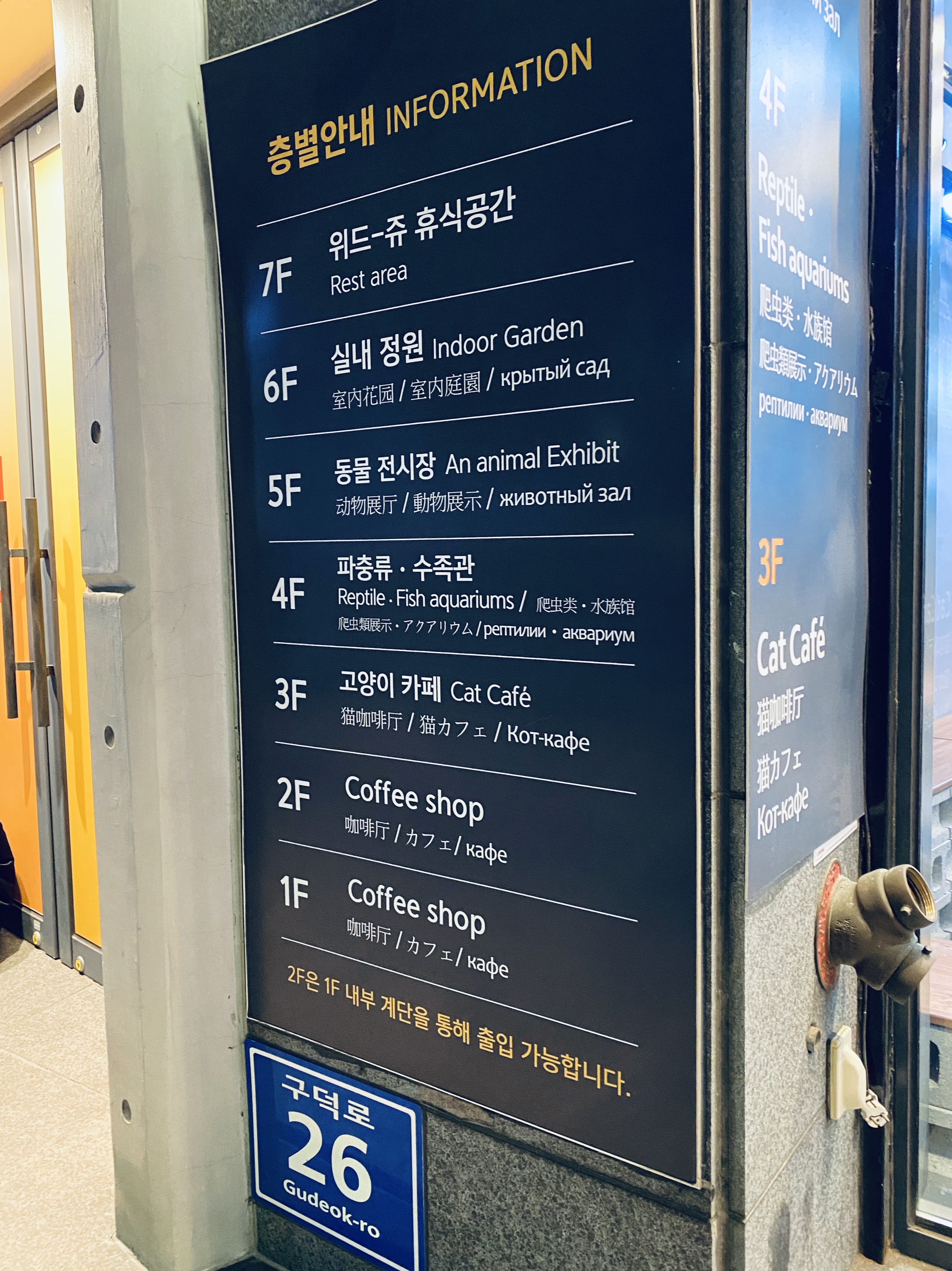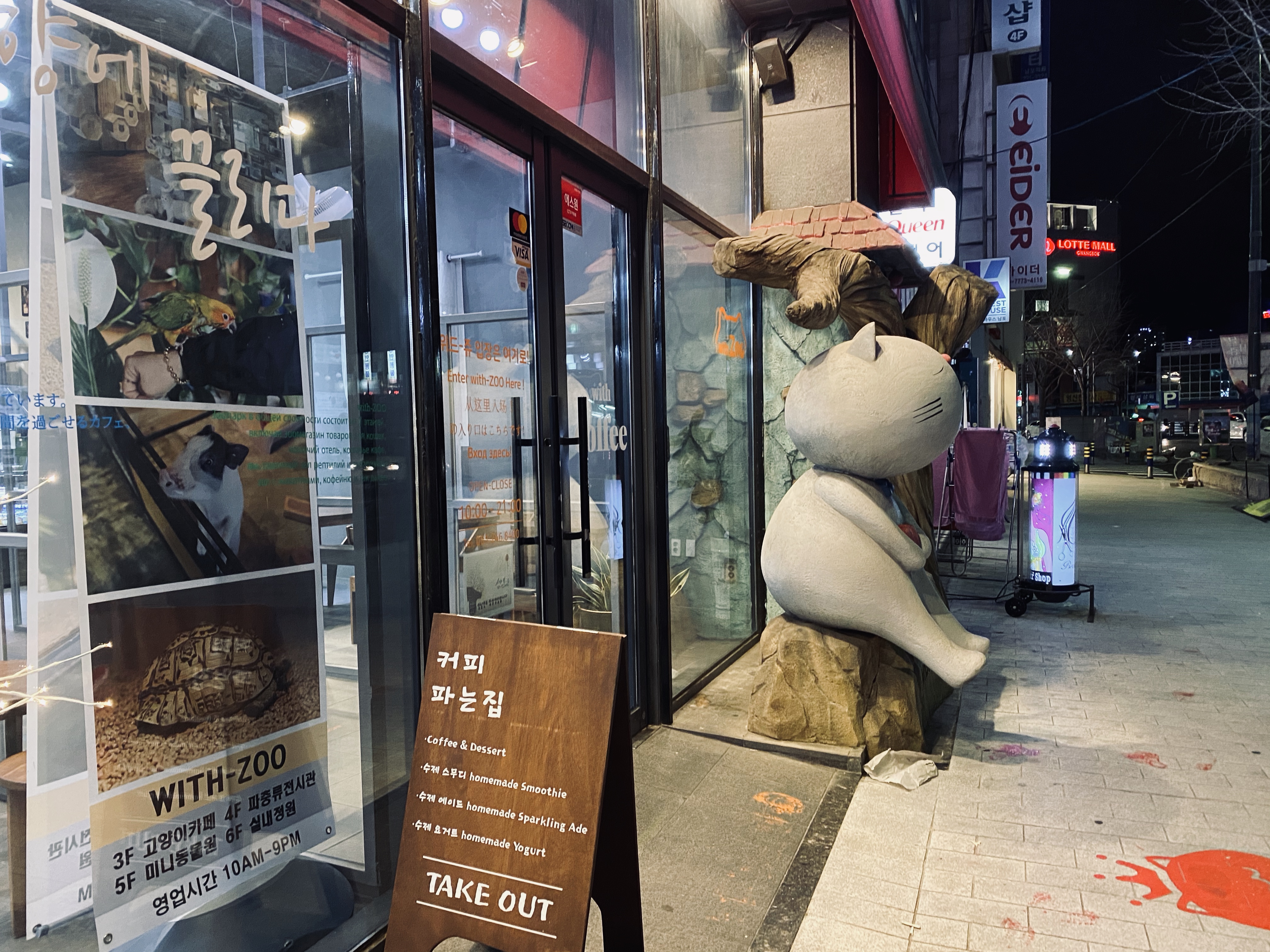 On our walk back to our hotel we saw a wok-fried octopus food stall but didn’t get it because we were already full. We regretted that so badly… but we ran into an entire building that is a zoo-themed café separated floor by floor depending on the animal species. There were animals like meerkat and rabbits and squirrels, even a small lamb and piglet, reptiles, birds, fish and lots of cats. The café also serves mini melts. It is the most beautifully furnished animal “café” that I have been to with an extensive range of animals and a beautiful indoor garden. The area is also very clean. The entrance fee is ₩5000 per person and includes a free drink.