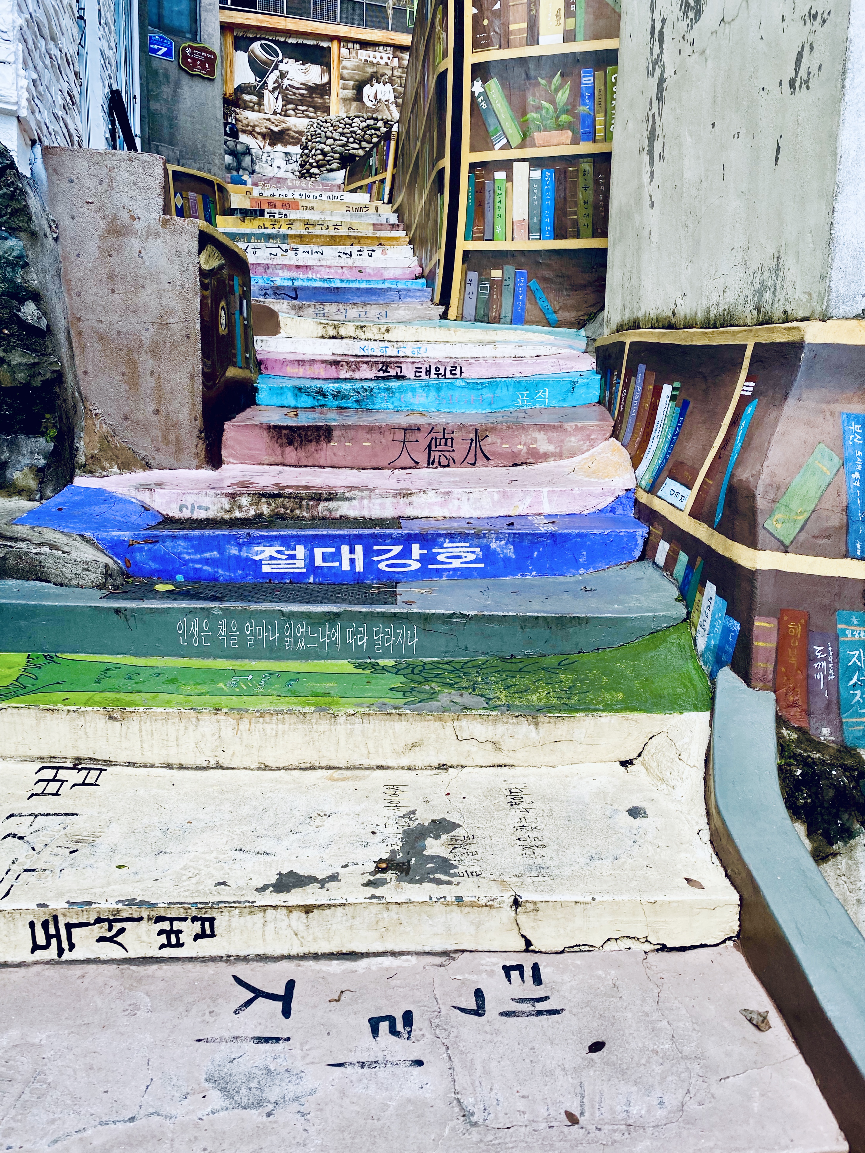 We took a cab from our hotel to the village, spent about twenty minutes in the area and then walked from Gamcheon back to the Nampo-dong area (Jung-gu) in the city center. It was about an hour’s walk down steep staircases and narrow alleys, often with a cat or two lying in the sun. I would highly recommend taking that unbeaten path, as you get to see an authentic Busan without make-up. Just use Naver to get a general sense of direction.