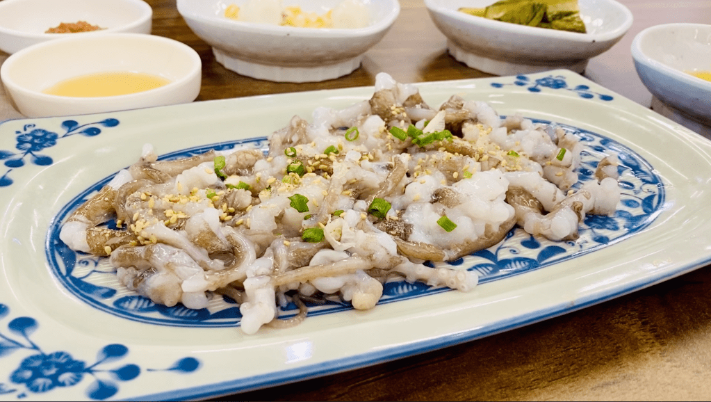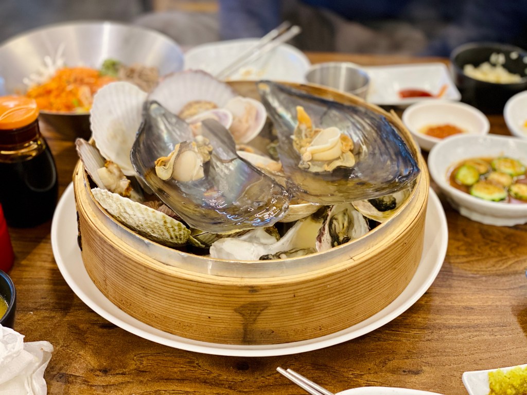 We decided to pick a proper restaurant called Bada (a minute walk from Jagalchi market) for lunch, where we had five kinds of freshly steamed clams, an assortment of raw sea bream and sea bass slices, as well as live octopus that still wriggles violently on your dish as you eat it. After ordering these three items, the waiter started to fill our table with nine complimentary “side dishes” including cold noodles, salad, pumpkin, grilled salmon, raw marinated prawns, lettuce and a few pickled dishes. That was seriously quite a feast. All the seafood we had were super fresh and sweet. Services were prompt and the place was clean.