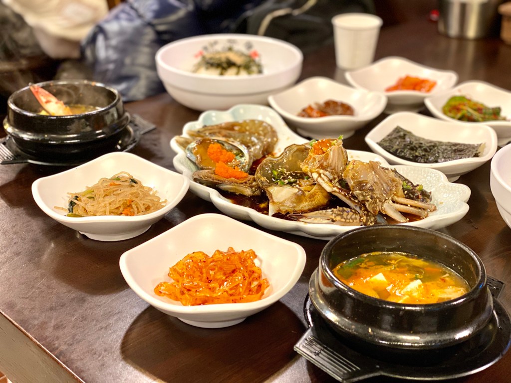 Raw marinated abalone was super crunchy and a bit strange, but still interesting to try. Prawns were nice and plump. The restaurant we visited was meant to be a very reputable one and it was a 80/20 local/tourist clientele on our visit. A raw crab set comes down to ₩19000-24000 depending on crab size (+₩15000-20000 per extra crab). An assorted seafood set with one crab, two abalones and three prawns would be ₩36000. Coffee is free. You can help yourself by the self service machine.