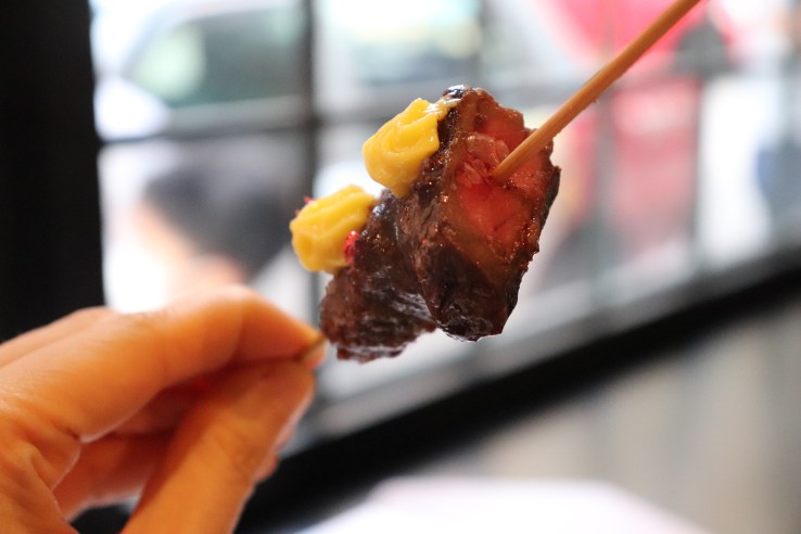 This was cubed skirt steak. It lacked both the tenderness of wagyu and the intensely beefy flavors of skirt steak. The cheese yolk on top was an interesting addition. No complaints there. Just an ordinary skewer we would say.