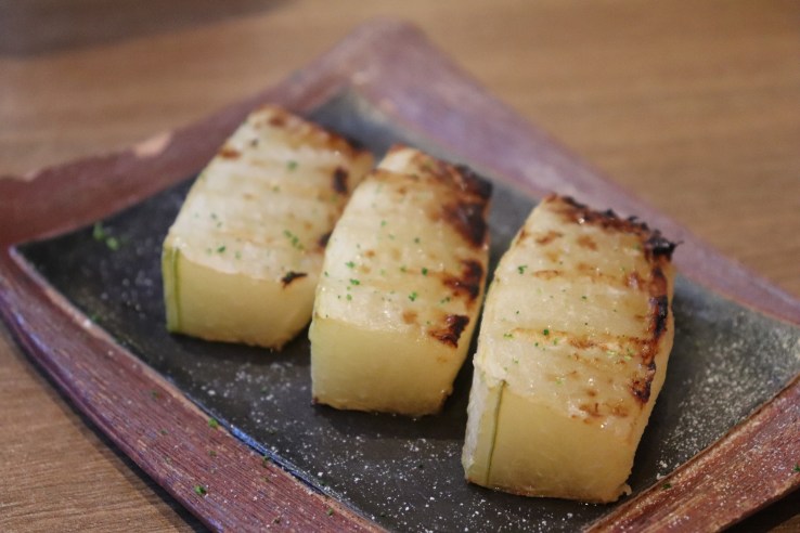 This was a star. Winter melons have a mild flavor profile and yuzu really brought its sweetness out. And we really liked the texture of grilled winter melon–with a slightly crisp outer shell and a mellow and soft interior it was divine.