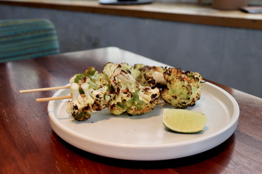 Roasted cauliflower skewers with vegan herb mayonnaise and togarashi, $65