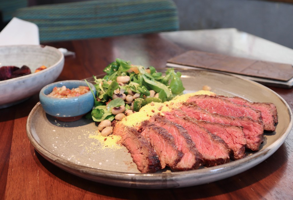 Grilled flank steak (300g) with farofa and feijão salad, $330