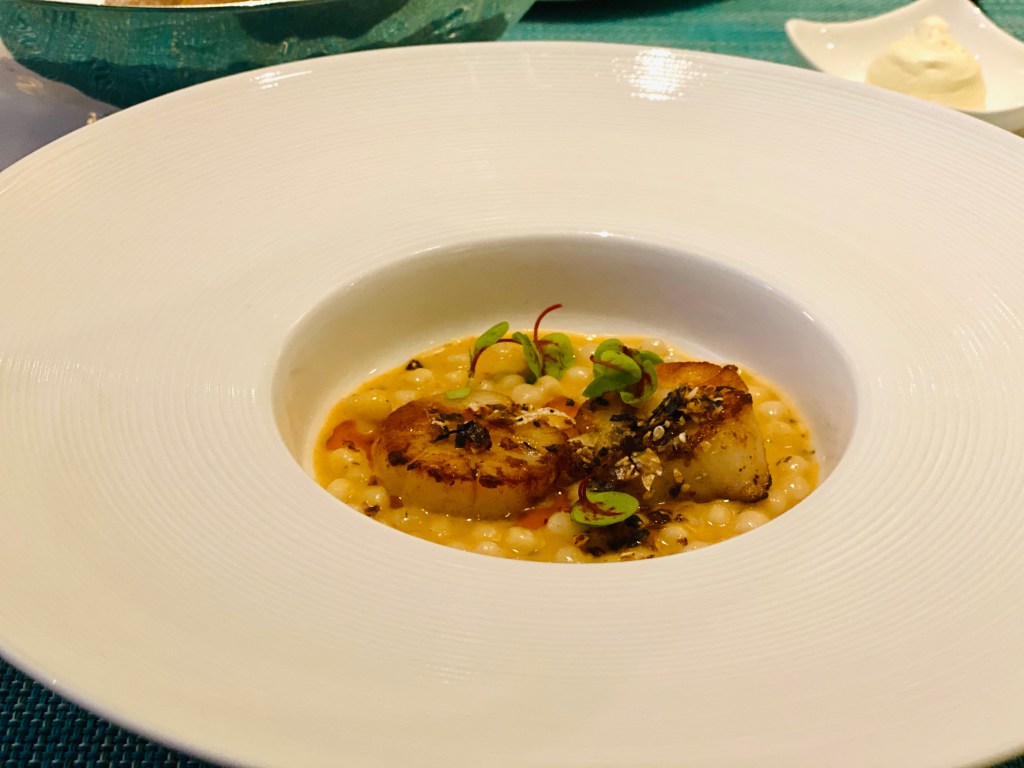People tend to disparage restaurants if they feel that the cooked seafood was once frozen, and I’m sure these scallops were quite likely frozen and have been criticized for such, but I tend to point out that seafood that are properly frozen and thawed could not be differentiated from live seafood by gourmets in blind taste tests, so I wouldn’t worry too much about frozen, especially as it gives us access to the best seafood from so much further away which should more than compensate for any differences arising from liveness – if at all.