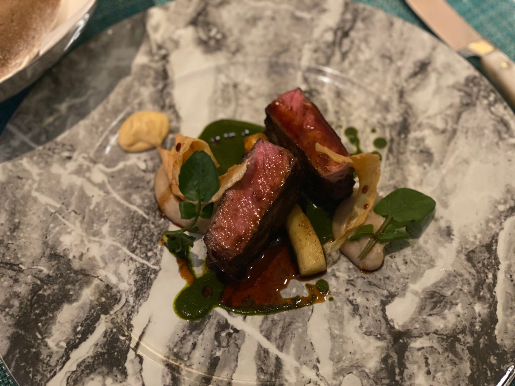 200-day grain fed beef striploin with watercress emulsion, creamed 5-spice-roasted parsnips, baby watercress and parsnip crisps