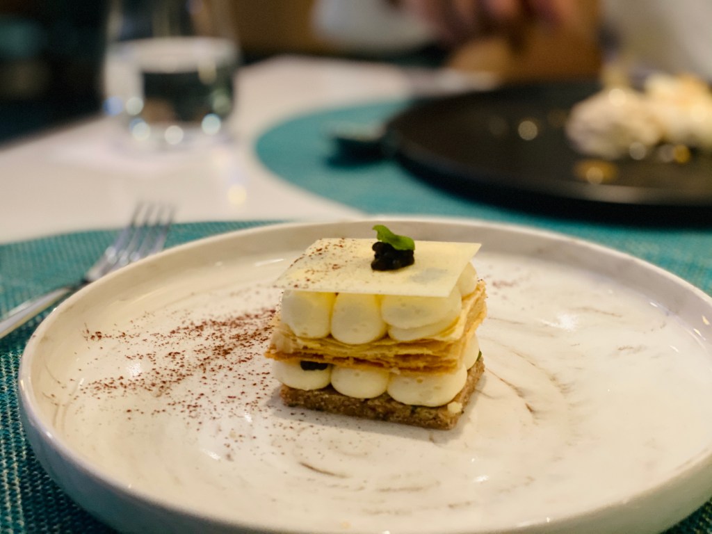 Anëo 34% white chocolate and Oscietre caviar millefeuille
