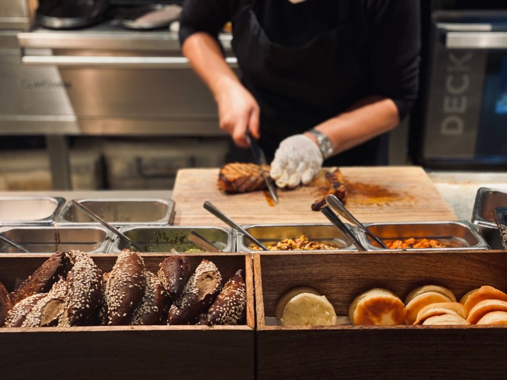 The kitchen is entirely open and you can see four staff members hard at work, repeating the cycle of taking out marinated meat, popping it in one of the ovens or smokers and then taking them out for slicing. They are extremely fast, their every movement so accurate and detached that the operation resembles a miniscule factory.