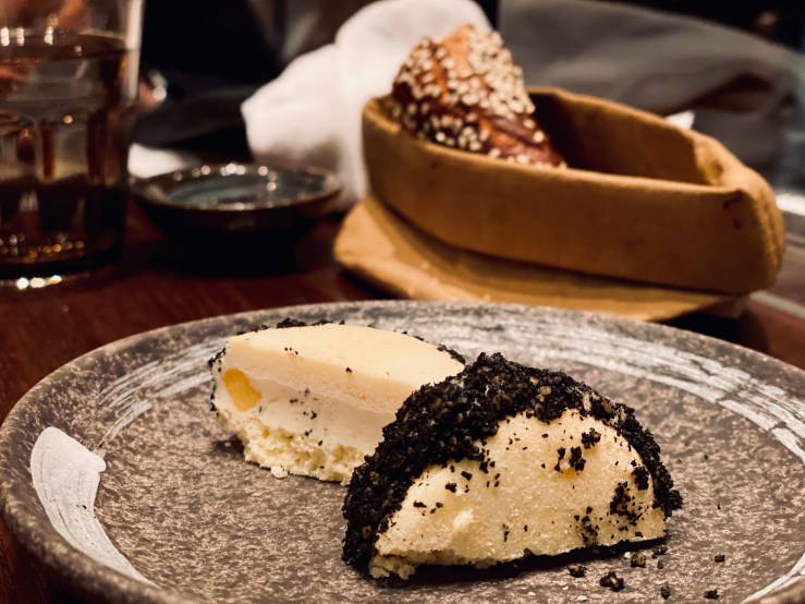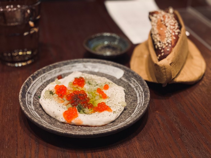 Pairing celery with a fishy duo of mackerel and salmon roe was a winner. The white stuff is blended cream with mackerel, and this seemed like more of a dip for bread than an appetizer per se, and I have trouble fathoming the idea of consuming a plate of cream just like that.
