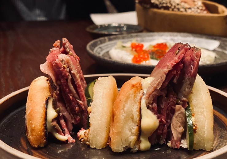 Starter – Pastrami muffin with cucumber and mustard, +$28