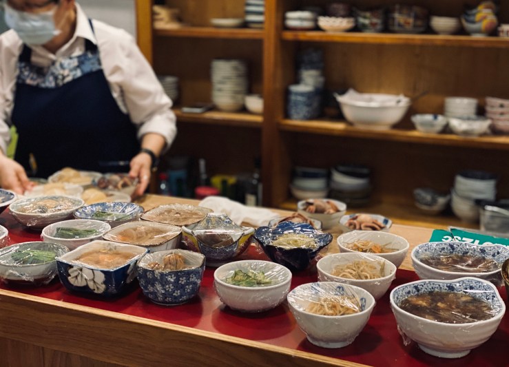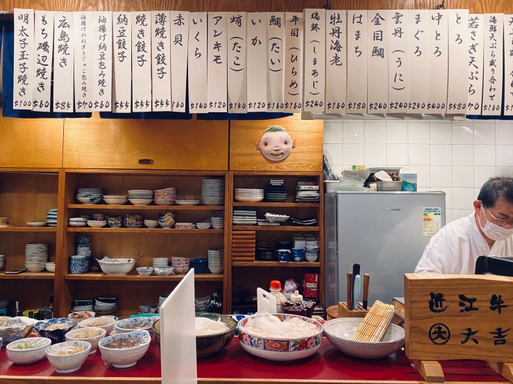 Arriving at 6, we were seated by the chef counter and I was able to see how a lot of the simmered/ boiled dishes were actually made in advance, plated in individual portions and sitting on the table waiting to serve the evening crowd that would be pouring in at around 7.