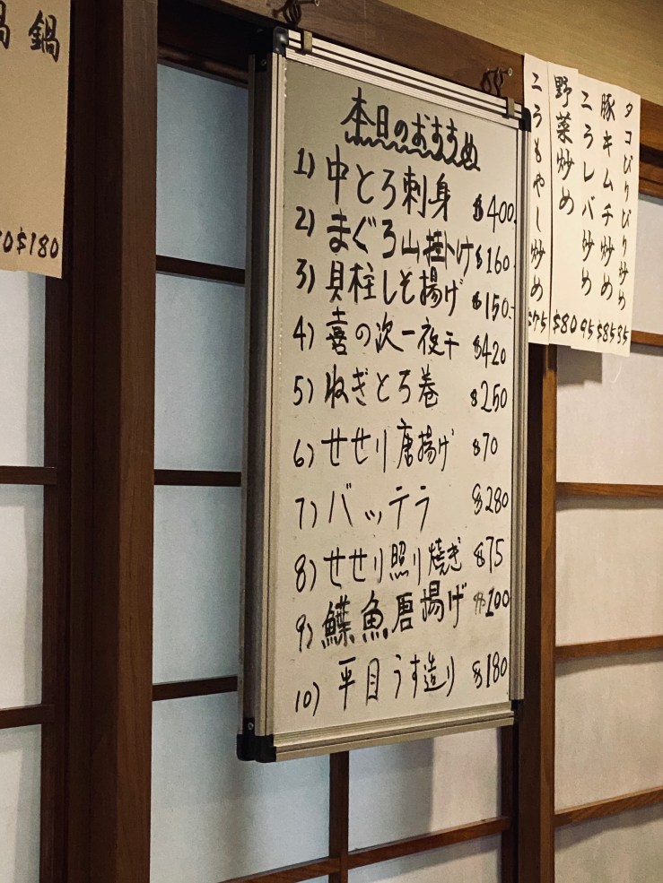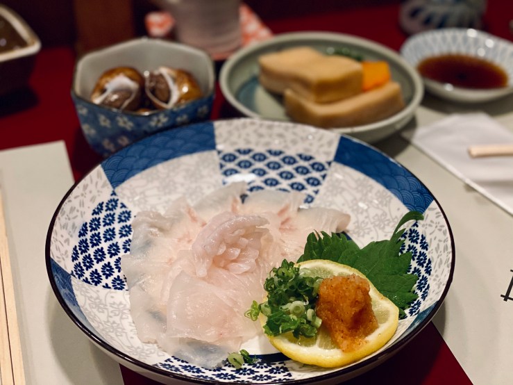 Flounder sashimi (~$200) / Simmered sea snail ($60) / Simmered tofu ($45)