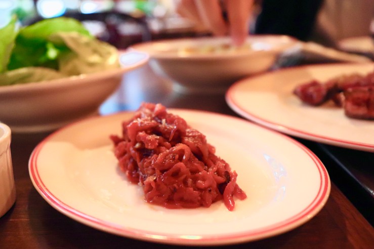Our steak looks a bit less oiled as I requested so but that absolutely did not compromise its flavor, which was a bit nutty and mushroomy. Given its rareness chewing time also increases and you get to really savor the essence of the meat.