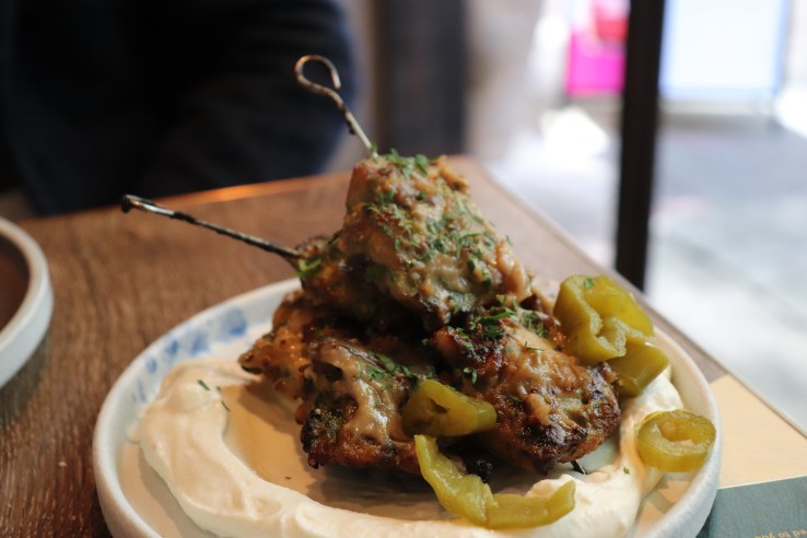 Chicken Skewers with garlic and pickled chilli (GF), $140