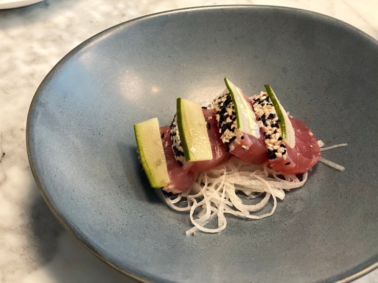This is the perfect starter for me because it’s so light and delicate. It comes with a bit of dashi for some flavor, while sesame, cucumber and daikon add a refreshing crunch.