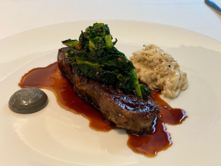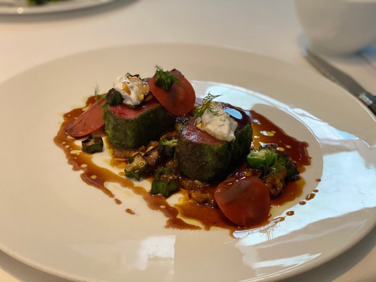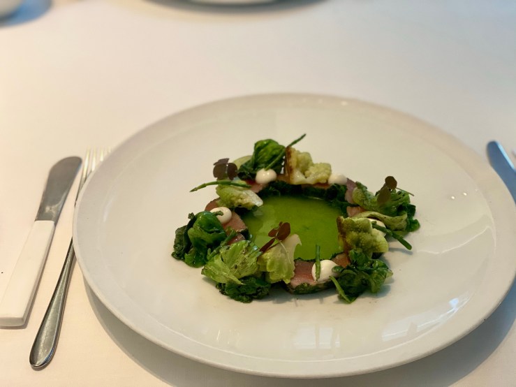 This was my perfect kind of starter: lightly seasoned seafood, ideally raw. But it also looked gorgeous, and had a number of delightful ingredients. The lovage gave the fish a pretty unique flavor and the charred lettuce and broccoflower were a great companion for the delicate rainbow trout—sweet and crunchy. Horseradish and smoked dashi lent the dish an extra depth that was memorable.