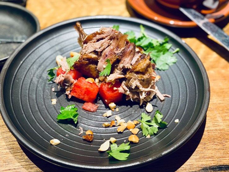 This was a refreshing combination of fresh herbs, watermelon, nuts and gamey duck. I skipped the hoisin sauce and it was still great for me. Adding the sauce gave it more of a taste of fusion to it, and duck does seem to work well with sweet sauces.
