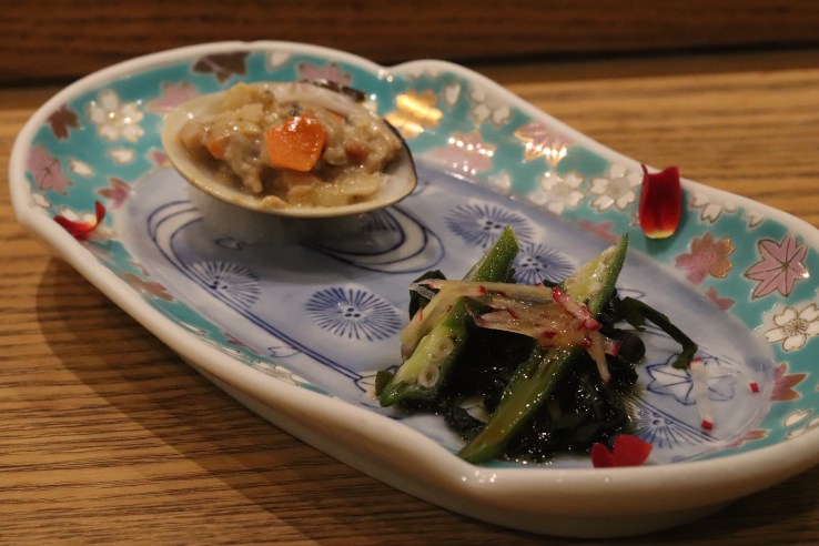 Some simple slices of okra with ponzu and wakame as well as clams with miso to start off the meal for both of us. Nothing overly intricate here.