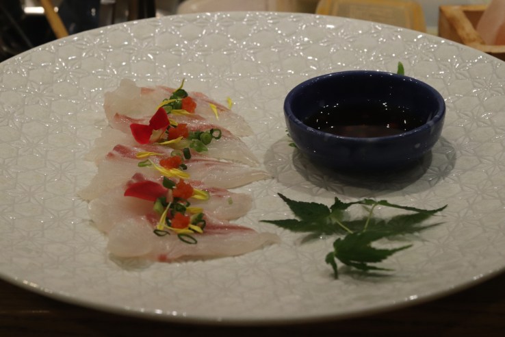 My three kinds of sashimi began with some light tasting sea bream 真鯛 with rose and chrysanthemum. March to June is madai season. The dip is a mild refreshing vinaigrette. Because many consider the flesh of madai to be rather bland, it is less often considered a star in contrast to fattier fish with more complex flavors. But if you focus your mind on it as you taste it, you may be able to appreciate its sweetness. I thought this could be sliced a bit thinner for a better mouthfeel.