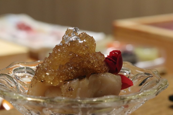 Next up was a lightly seared large scallop 炙りホタテ with ponzu jelly and rose. This turned out to be one of the best dishes tonight. The meaty scallop was oh-so-sweet and its butteriness was brought out completely by a quick sear.