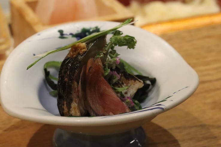Seared saba 関さば with grated ginger was a similar delight. This seki-saba comes from Kyushu’s Oita (大分県), which is known for its special standards on fishing and killing saba that make them extra delicious. The dish was, again, well executed. The seki-saba was a bit aged and flavors were strong without being unpleasantly fishy, the texture was firm and its umami brought out by sweet soy sauce and a tincture of bitterness from the greens and the flowers.