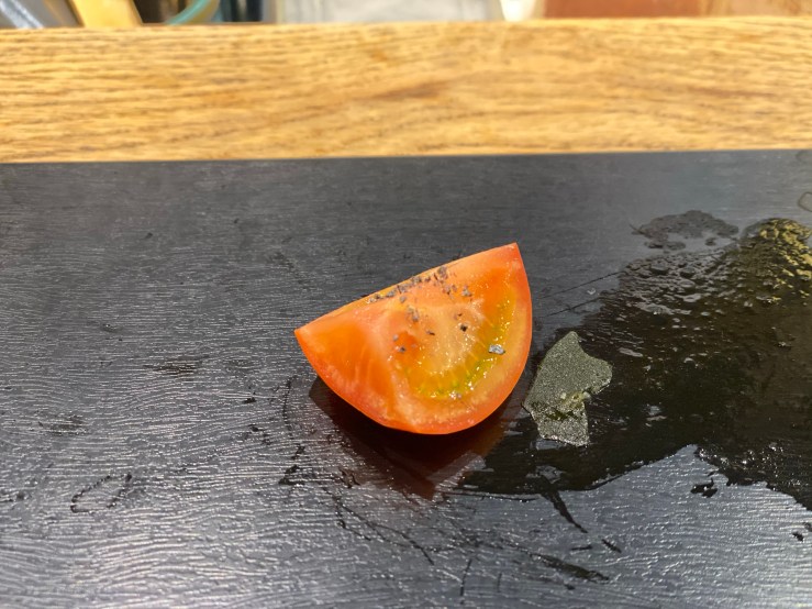 Chef gave us a special second dessert: a fruit cherry tomato, so full of sweetness and a piquant brightness in the mouth that it holds up even after the two sweet desserts that preceded it.