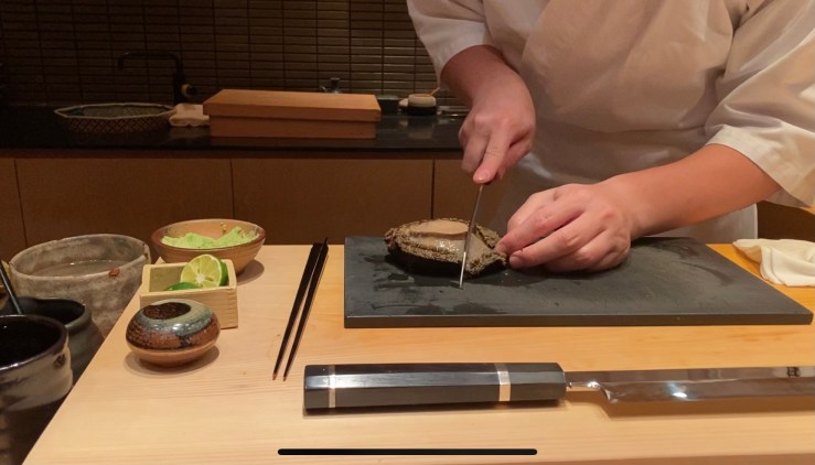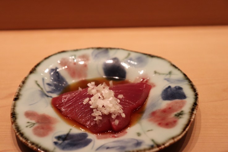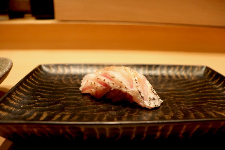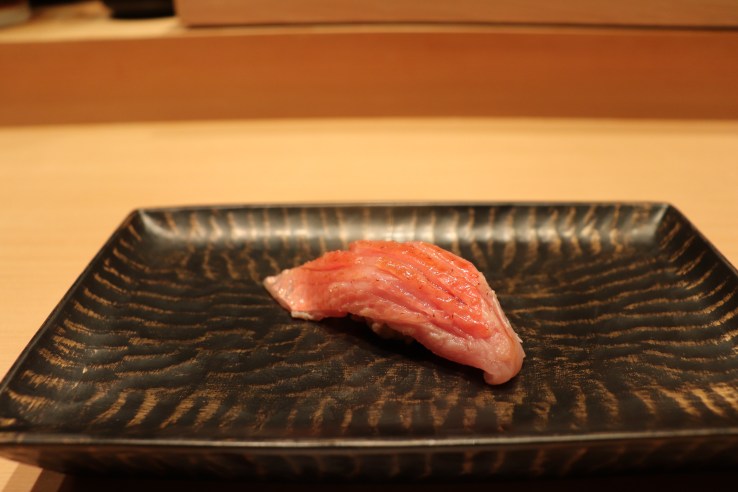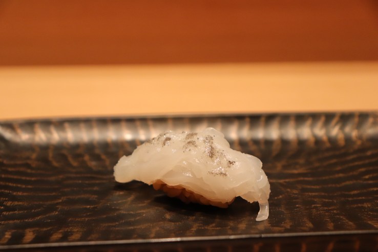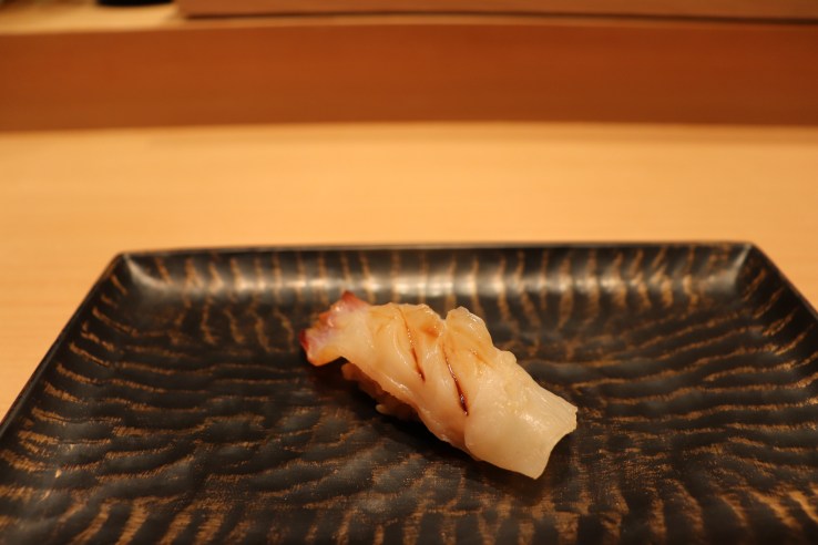 This (bluefin) tuna….was truly the best I have had this year (third “stunning item”). One often gets a bit of an unpleasant, acidic aftertaste with akami, which might even be considered somewhat of a signature “tuna” taste. But I realized that’s not necessarily the case until I had this piece. The piece was trimmed over and again. There was zero sinew, the taste was completely “clean”, and the balance was just perfect.