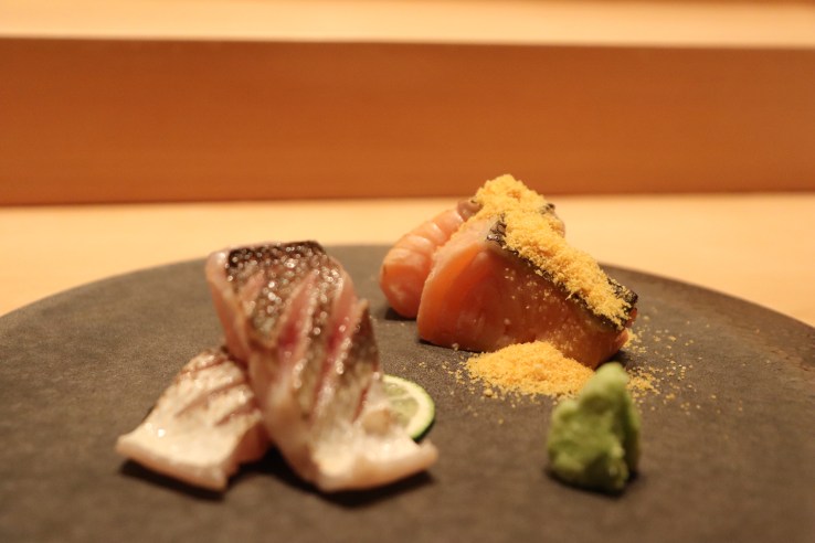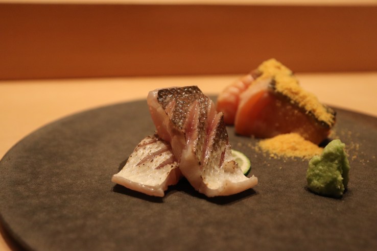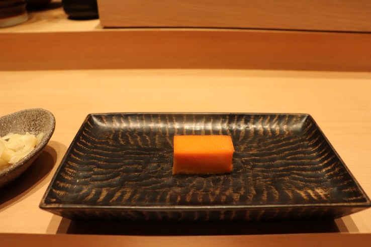 Smoked tokishirazu (the pink pieces at the back) was heavenly—the first “stunning item”. Toki shirazu is chum salmon, one of the most expensive fish on the market, caught from spring to early summer. Its name means “not knowing the time” and these delicious fish are found at the intersection of rivers and ocean. The flesh was fatty and sweet, which balanced well with the smokey aroma and savory karasumi (salted mullet roe).