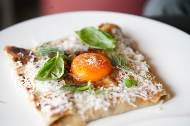 Somehow I was expecting a galette but on second thought I suppose this was crêpe made with buckwheat flour, which disappointed me a little but in any case was a nice little dish for what it was. The portion of raclette in this was super generous and there were also courgettes inside. The only complaint is the excess of salt on the egg yolk which made the dish way too salty for us to finish.