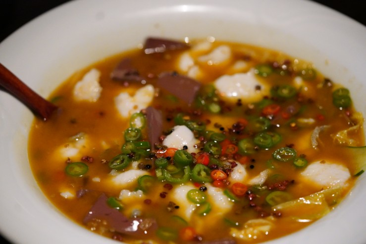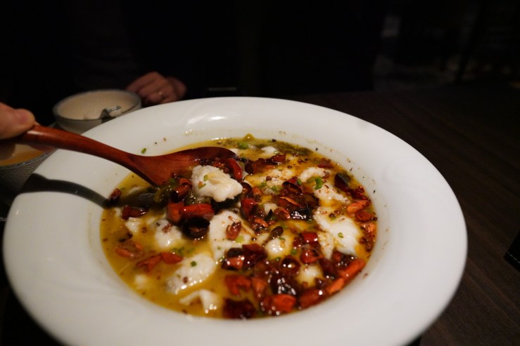 Chinese perch / Cucumber / Duck blood curd, 花椒桂花魚, $498