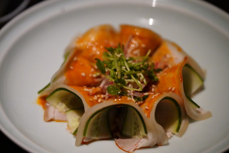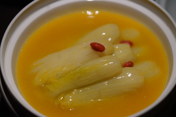 The chuan chuan are OK, because the sauce is quite like what I have had in China. The attempt to give them an appearance in a high-end restaurant is applaudable, but I don’t feel satisfied with such a small quantity (I finished all of them in a split second), and baby abalone seems out of place. At street-side restaurants in China, people would have hundreds of these and enjoy the fun of ticking off favorites from a long list.