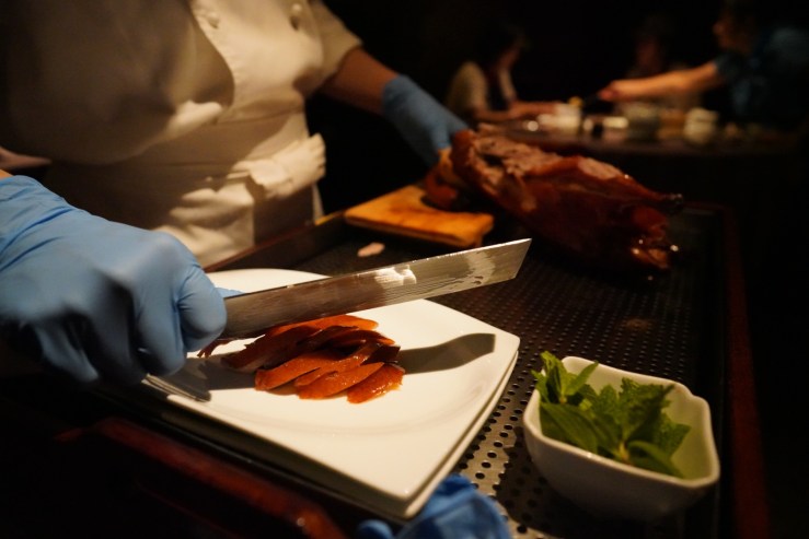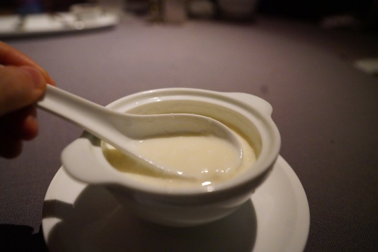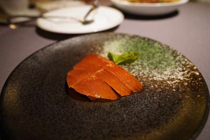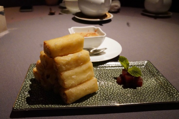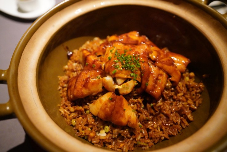 On our visit, the dietary restrictions of our entire party altogether meant we had to stay away from shellfish and beef, so we shared between the four of us Peking duck, sea anemone sweet potato noodles, baked fresh pomfret rice, stir-fried dried tofu with Chinese chives and braised radish. For dessert, we had deep-fried rice cakes with osmanthus syrup and almond sweet soup with egg white.